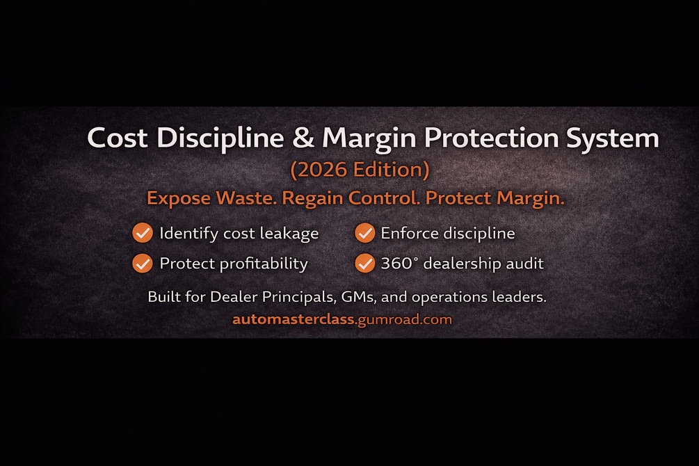 The Cost Discipline & Margin Protection System (2026) gives senior automotive leaders a practical framework to expose waste, regain cost control, and protect margin — without damaging performance. Built for Dealer Principals, GMs, and operations leaders.